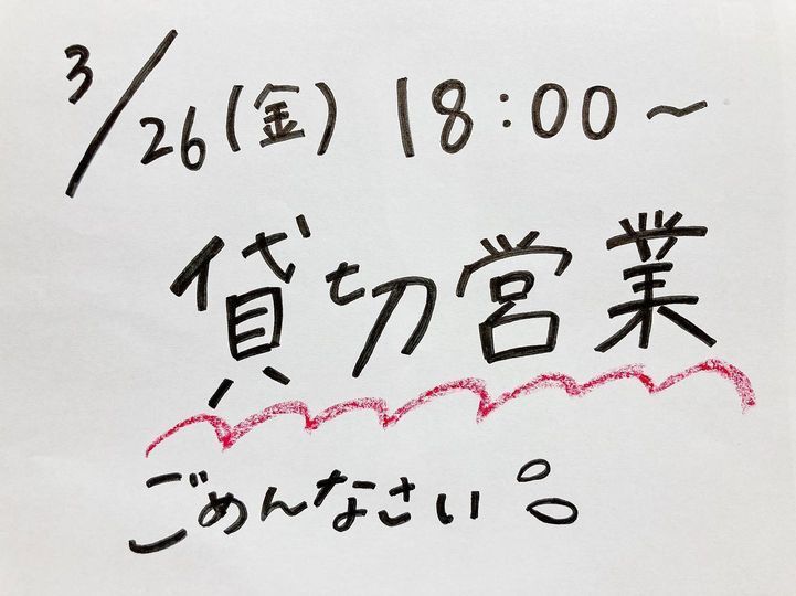 本日(3月26日金曜)18:00から閉店まで、貸切営業です📢