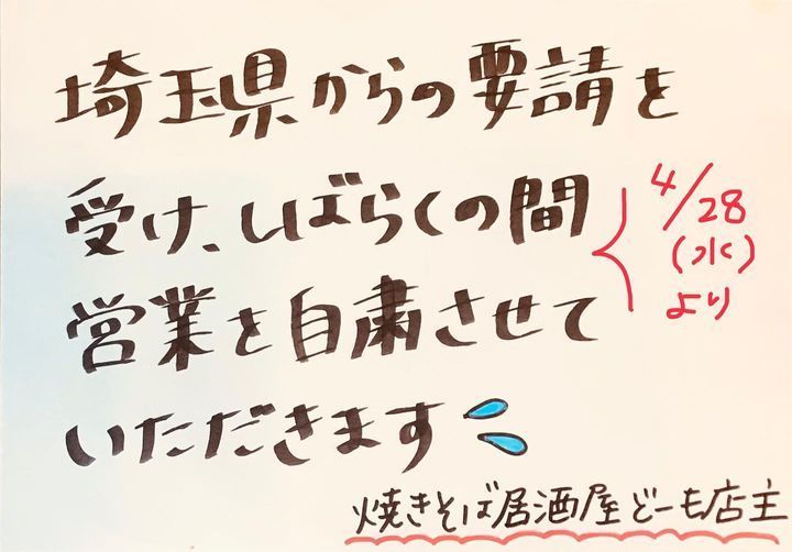 埼玉県からの要請を受け、当店は4月28日(水)から営業を自粛し、完全休業とさせて頂きます。