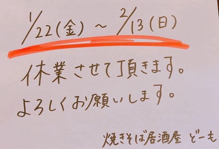 電話はつながりにくくなると思いますので、お問い合わせは公式LINE「焼きそば居酒屋どーも」にメッセージをお願いします(返信遅れてしまったらすみません)。