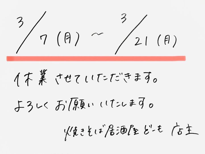 電話はつながりにくくなると思いますので、お問い合わせは公式LINE「焼きそば居酒屋どーも」にメッセージをお願いします(返信遅れてしまったらすみません)。